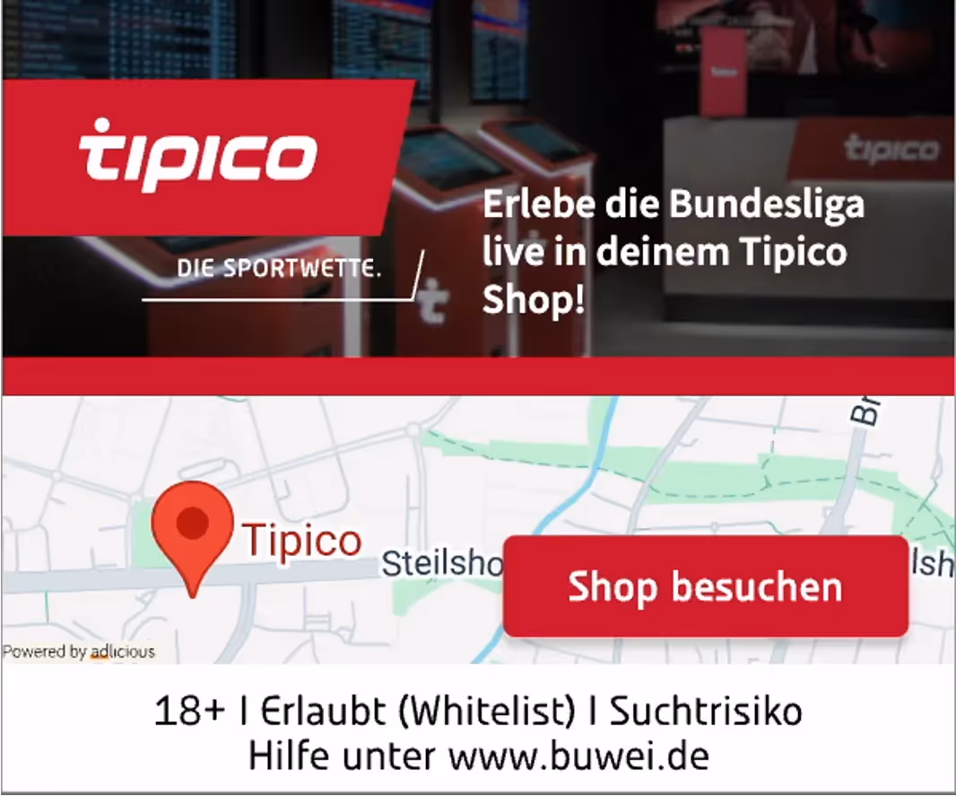 The campaign combined dynamic display drive-to-store banners with targeted brand messages. In the branding area, up-to-date news was delivered, such as top games such as Borussia Dortmund vs. Bayer Leverkusen or generic messages such as "Experience the Bundesliga live in your Tipico shop!". The target group — men aged 18 and over with an interest in sports and sports betting — was addressed based on their location.