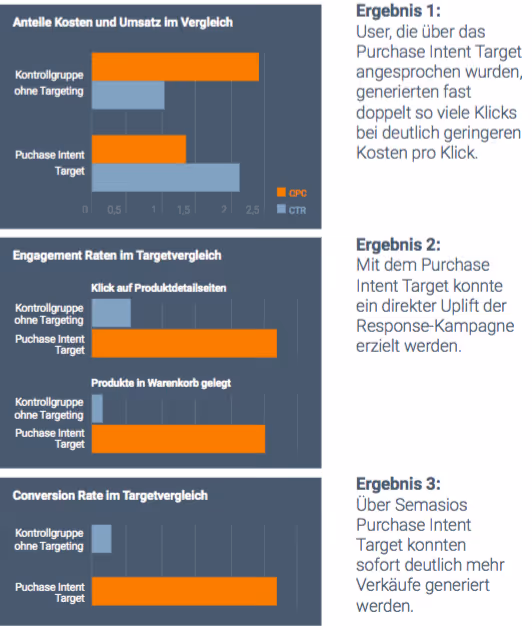To ensure that only potential new customers are addressed, all existing customers were flagged and excluded from advertising material before the campaign was launched. that Purchase Intent Target “People interested in jewelry” and an untargeted control group were controlled programmatically in parallel under otherwise the same conditions. Die scores: Users who were targeted via Purchase Intent Targeting generated almost twice as many clicks at significantly lower costs per click. A direct uplift of the response campaign was achieved and significantly more sales were generated immediately.